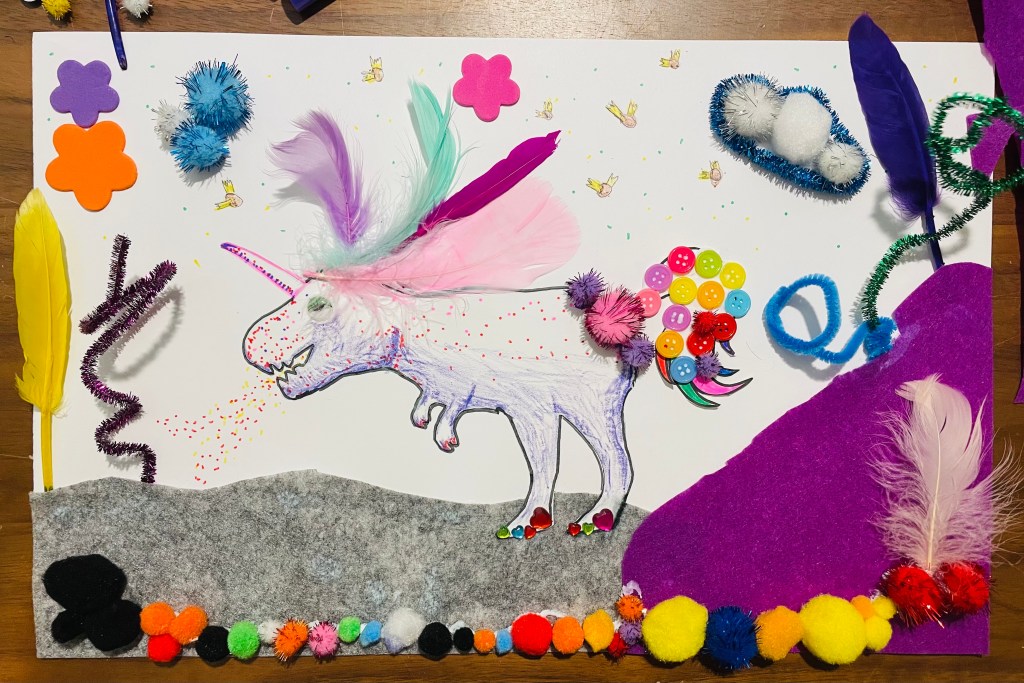 - Assorted collage making items: colored felt, feathers, beads, glitter, sequins, leaves, flowers, pom poms, wiggle eyes, popsicle sticks, pipe cleaners, and magazines – to name a few!